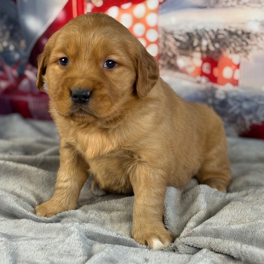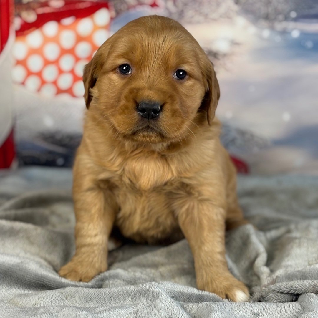 Hi, I’m Jolene! I’m a 5-week-old female Golden Retriever with a beautiful golden coat. When I reach my adult size, I should weigh between 45–75 lbs. I’m ICA registered. I will fill your home with warmth and puppy love.